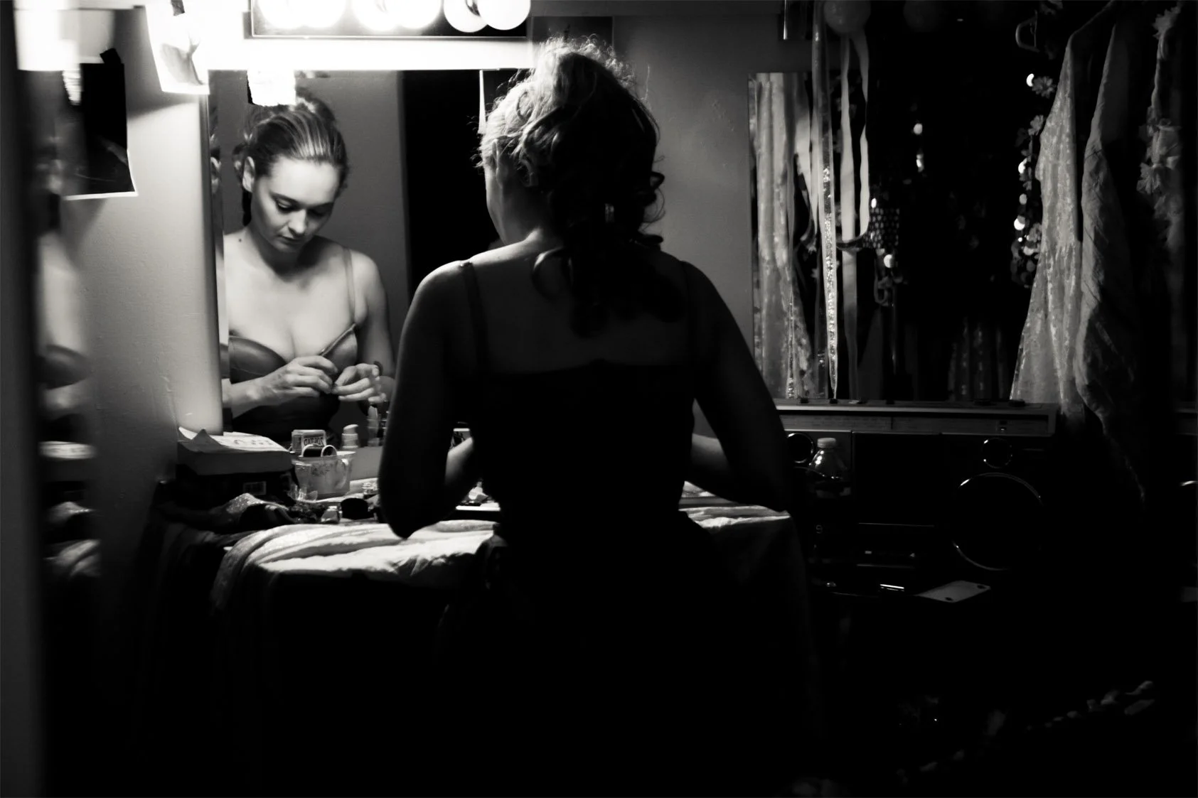 The theater is a space taken for granted, imbued with it's own rules.  Enter theater/Sit/Read program/Lights down/Show/Lights up/Clap/Exit. PLASTICLAND subverts theatrical expectations.  Sacred spaces, like the dressing room, are revealed and invigorated by soundscapes and text.  The audience is asked to cross through “The Curtain” and meet the performers onstage, while performing.   With only 23 people in the audience,  every member is given a chance to be themselves instead of just a face sitting passively in the dark.  A groundbreaking new type of audience + performer relationship is established as the show evolves.